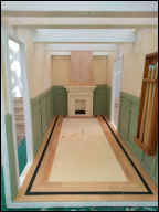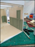 Foto 1 : Het hoge gedeelte van de lambrisering is voor biljartkeu rek. Foto 2 : Totaal overzicht van de lambrisering. Foto 3 : Het gekozen behang.
