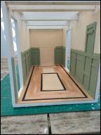 De vloer is een parketvloer met zwarte bies in het verstek gelegd.