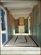 De openhaard in de biljartkamer is tegen de achterwand geplaatst (de achterwand met het creme behang is te verwijderen) om zo daar een knus hoekje te creëren. De kap van de openhaard is beplakt met hetzelfde behang als de achterwand, de openhaard zelf is in een creme zijdeglans acrylverf geschilderd.