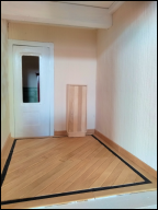 De parketvloer is diagonaal er in gelegd en heeft een zwarte strip.
