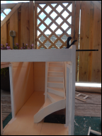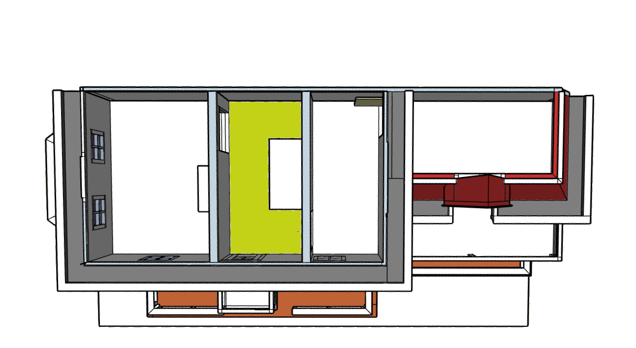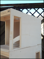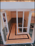 Het heeft 2 deurkozijnen, een voor de slaapkamer en een voor de biljartkamer-bibliotheek. In de losse gevel van het hoofdgebouw zit een raamkozijn met roeden.