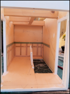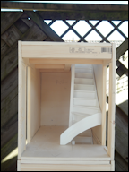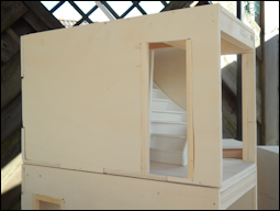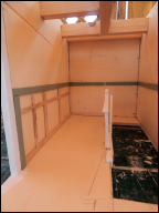 Foto 1 : Trap aanpassen. Foto 2 : Start met de lambrisering. Foto 3 : Lambrisering klaar. Foto 4 : Lambrisering 1e kleurlaag.