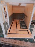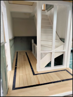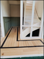 De parketvloer is recht erin gelegd en heeft een zwarte strip.Het parket is gemaakt van knutselhoutjes en dan geschilderd met een lichte beits.