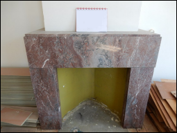 Uiteindelijk de haard smaller gemaakt en de vloer aangepast.(zie foto 5) Foto 1-3 : De opbouw nieuwe haard. Foto 4 : De haard in marmerstructuur geschilderd.