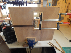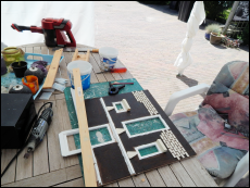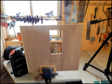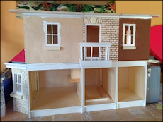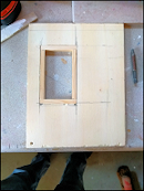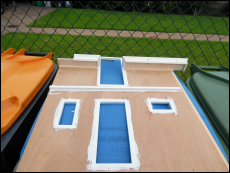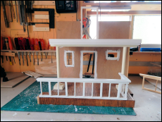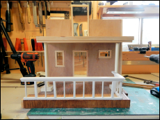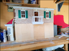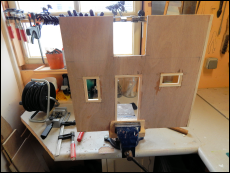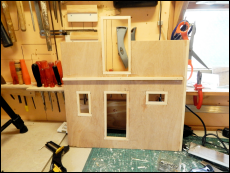 De voorgevel aanbouw op maat gezaagd uit 9 mm multiplex. Waarna ik de raamkozijnen en deurkozijnen opnieuw heb uit gemeten de grootte van de raamkozijnen heb aangepast. B.v. het raamkozijn in de badkamer is een stuk kleiner geworden in deze versie.