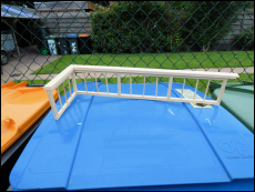 De overkapping van de veranda van de aanbouw is een balkon geworden. Deze voorgevel was nog steeds van MDF. Doordat ik de overkapping wilde vervangen door een balkon moest er een balkondeurkozijn komen in de bibliotheek. Door de goot er aftehalen begon de MDF los te laten. Ik heb besloten om de gevel op nieuw te maken van triplex 9mm.