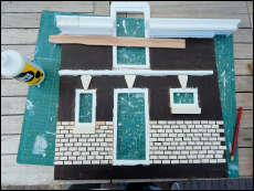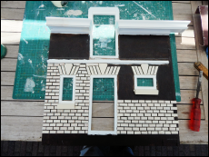 De triplexplaat van de gevel donkerbruin geschilderd en een aantal oude gevelstenen schoongemaakt van lijmresten en een groot aantal nieuwe erbij gemaakt en geschilderd.