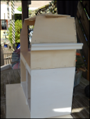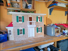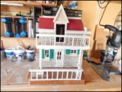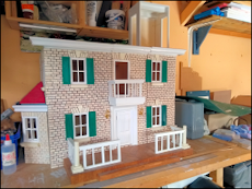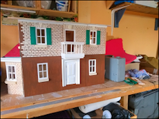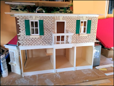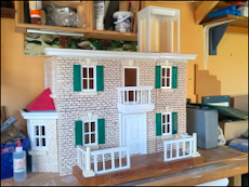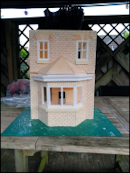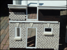 Foto 3 : Balkonhek aangebracht en de gevelsstenen geschilderd. Foto 4 : De rechter en linkerkant de raamkozijnen afgetekend om de symmetrie goed te krijgen. Foto 5 : Kozijn er in gezet. Foto 6 : Gevels slaapkamer en bijartkamer kozijnen/goot aangebracht. Foto 7 t/m 9 : Gevelsstenen aangebracht. Foto 10 t/m 15 : De invulling van de onderste deel van de gevels. Foto: 16 : Met verlichting naast de voordeur.