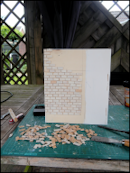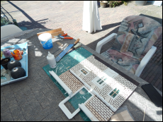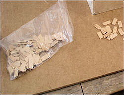 Foto 1 : Een zakje knutselhoutjes en knipschaar voor laminaatplinten hiermee knip ik de steentjes op maat. Foto 2 : de steentjes.