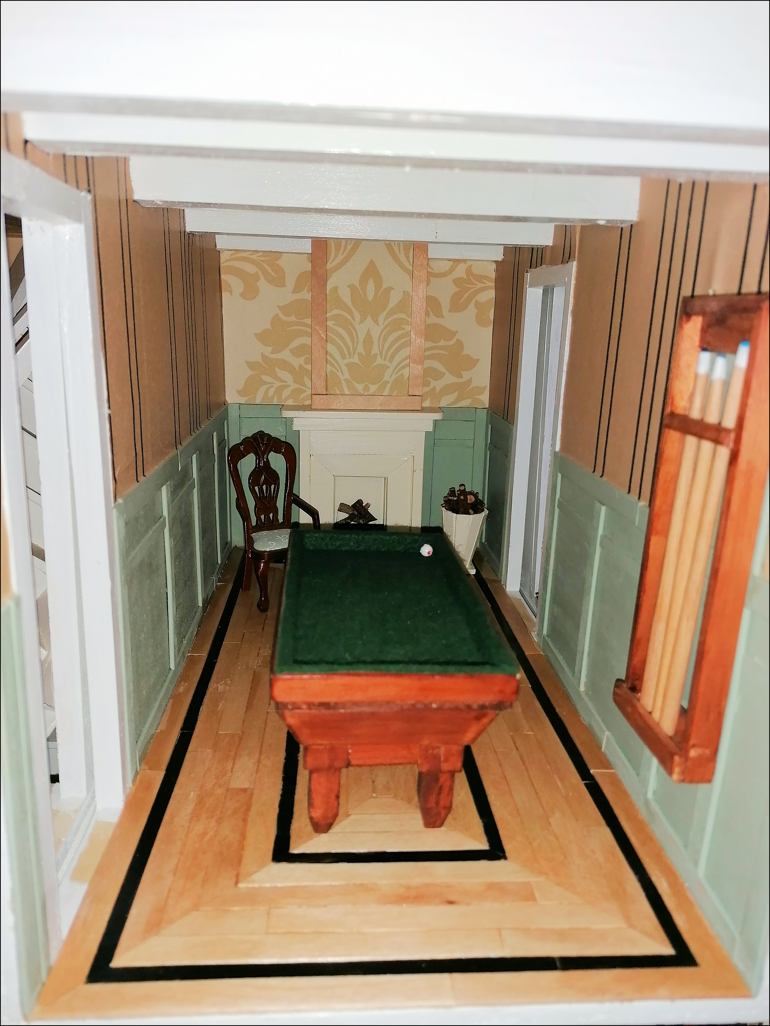 De openhaard in de biljartkamer is tegen de achterwand geplaatst (de achterwand met het creme behang is te verwijderen) om zo daar een knus hoekje te creëren. De kap van de openhaard is beplakt met hetzelfde behang als de achterwand, de openhaard zelf is in een creme zijdeglans acrylverf geschilderd.