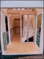Foto 1 : Trap aanpassen. Foto 2 : Start met de lambrisering. Foto 3 : Lambrisering klaar. Foto 4 : Lambrisering 1e kleurlaag.
