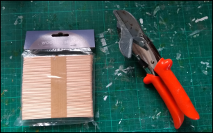 Foto 1 : Een zakje knutselhoutjes en knipschaar voor laminaatplinten hiermee knip ik de steentjes op maat. Foto 2 : de steentjes.